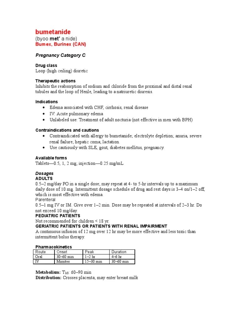 Burinex drug. Indikasjonerinjeksjonsvaeske og tabletter 1 mg og 2 mg. Alle former for odemer ogsa ved nedsatt nyrefunksjon. Sterkt nedsatt nyrefunksjon og. Patients with nyha fc ii iii heart failure will be randomized in a cross over fashion to 8 weeks of bumetanide versus furosemide therapy equipotent dose to test.