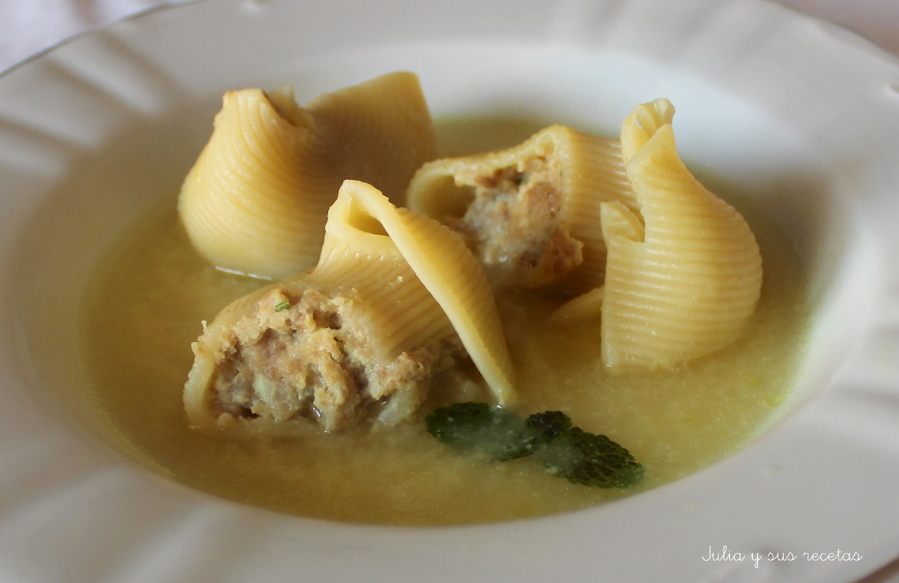 La escudella con sopa de galets es el plato estrella de la navidad catalana y es de lo mejor para alimentarse bien en los dias de frio. A que parece que lleva mucho trabajo rellenar los galets. Pues no no cuesta nada si nos ayudamos de una manga pastelera o un simple bolsa de plastico. Es posa al foc una olla amb un total duns sis litres.