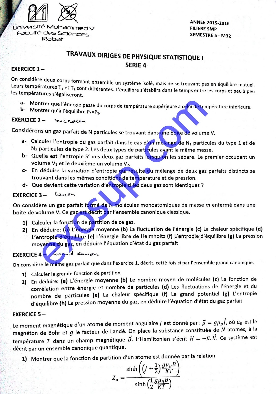 Controles Corriges Physique Statistique I Smp S5 Fs Rabat