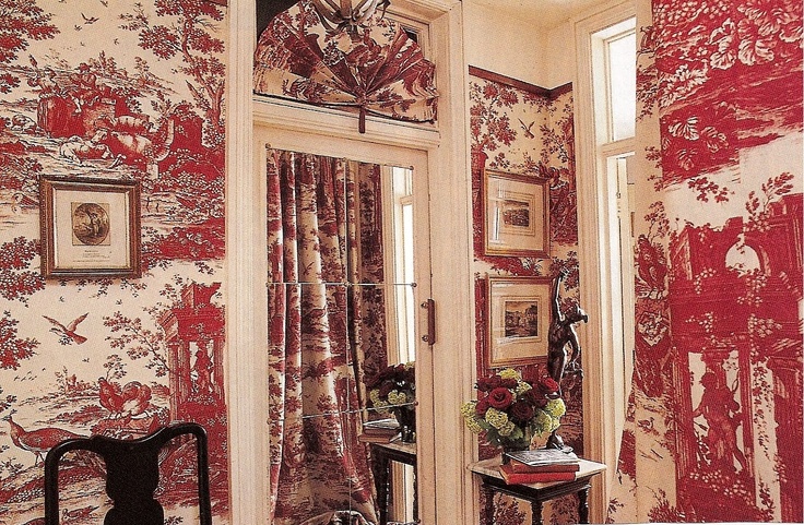 Toile de jouy wallpaper red. Toile is a fabric from the french word meaning linen cloth or canvas particularly cloth or canvas for painting on. The word toile can refer to the fabric. From the french toile de jouy toile is a distinctive decorating pattern from eighteenth century europe. At the time only the upper class could afford this.
